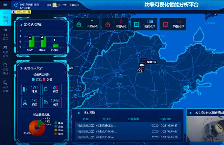 利用人工智能、物联网、移动互联、视频/图像、状态感知等技术,结合以场景和应用为基础的云管边端的技术架构,实现配电网各场景的电气设备状态、环境、安防、外力破坏、火灾等数据信息的监测、整合及预警处理,实时反映现场运行工况,通过联动控制,保证配电网安全运行,防止因环境改变、非授权活动、设备状态变化等引起的事故,满足对配电网远程运维的可靠管控。
